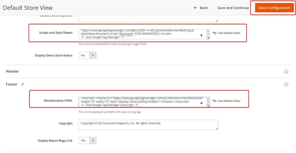 5. Once in the HTML Head, copy the codes you got from the GTM. Paste the <head> in the Scripts and Style Sheets section and the <body> code in Footer → Miscellaneous HTML.