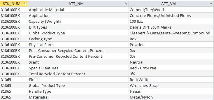Each of the 25,000 SKUs has at least 4 attributes. There are about 270 unique attributes and the attribute values are almost all unique. Here is a screenshot of a section of my database attribute query. You can see that this one product has 12 different attributes.