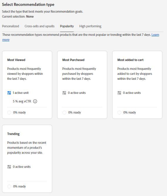 Some machine learning models must be trained over time with sufficient data. Readiness indicates when a model can provide a sufficient number of variety of products for a chosen recommendation type.